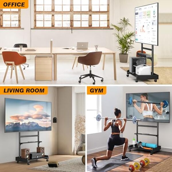 TVON Support TV sur Pied pour Téléviseur de 40-86 Pouce Ecran LED LCD Plasma, Support TV roulettes avec Socle en Bois Réglable en Hauteur Chariot TV avec Étagère Jusqu 'à 68 kg Max VESA 600x400 mmCompatibilité:Ce support TV universel convient à la plupart des téléviseurs plats ou incurvés Plasma LCD LED OLED de 40 à 86 pouces.Modèle de trou VESA compatible 100mm x 100mm à 600mm x 400mm.S'adapte à une variété de marques de téléviseurs. Réglable en hauteur:Le support du meuble TV haut a quatre réglages de hauteur, de 1295 à 1520mm, et l'étagère a six réglages de hauteur, de 387 à 587mm, ce qui vous permet de régler la hauteur de visionnement parfaite. Support solide:Ce meuble TV est constitué d'une base en bois de 12 mm et de deux poteaux. Avec une charge maximale de 68 kg pour le meuble TV, 30 kg pour la base en bois et 10 kg pour les étagères, le meuble TV est non seulement élégant et solide, mais il permet également d'économiser de l'espace en accueillant de petits appareils tels que des chaînes stéréo. Mouvement pratique:Quatre roulettes robustes verrouillables à 360° facilitent le déplacement du meuble. Ce support assure un déplacement fluide et facile à travers différentes pièces, ce qui le rend idéal pour une utilisation à la maison et au bureau. Assemblage facile:Le meuble TV noir est livré avec des instructions graphiques claires et faciles à suivre.Suivez les instructions pour installer avec succès et rapidement le meuble TV.Avec sa construction robuste et son installation facile, c'est une solution de première classe pour votre maison ou votre bureau.